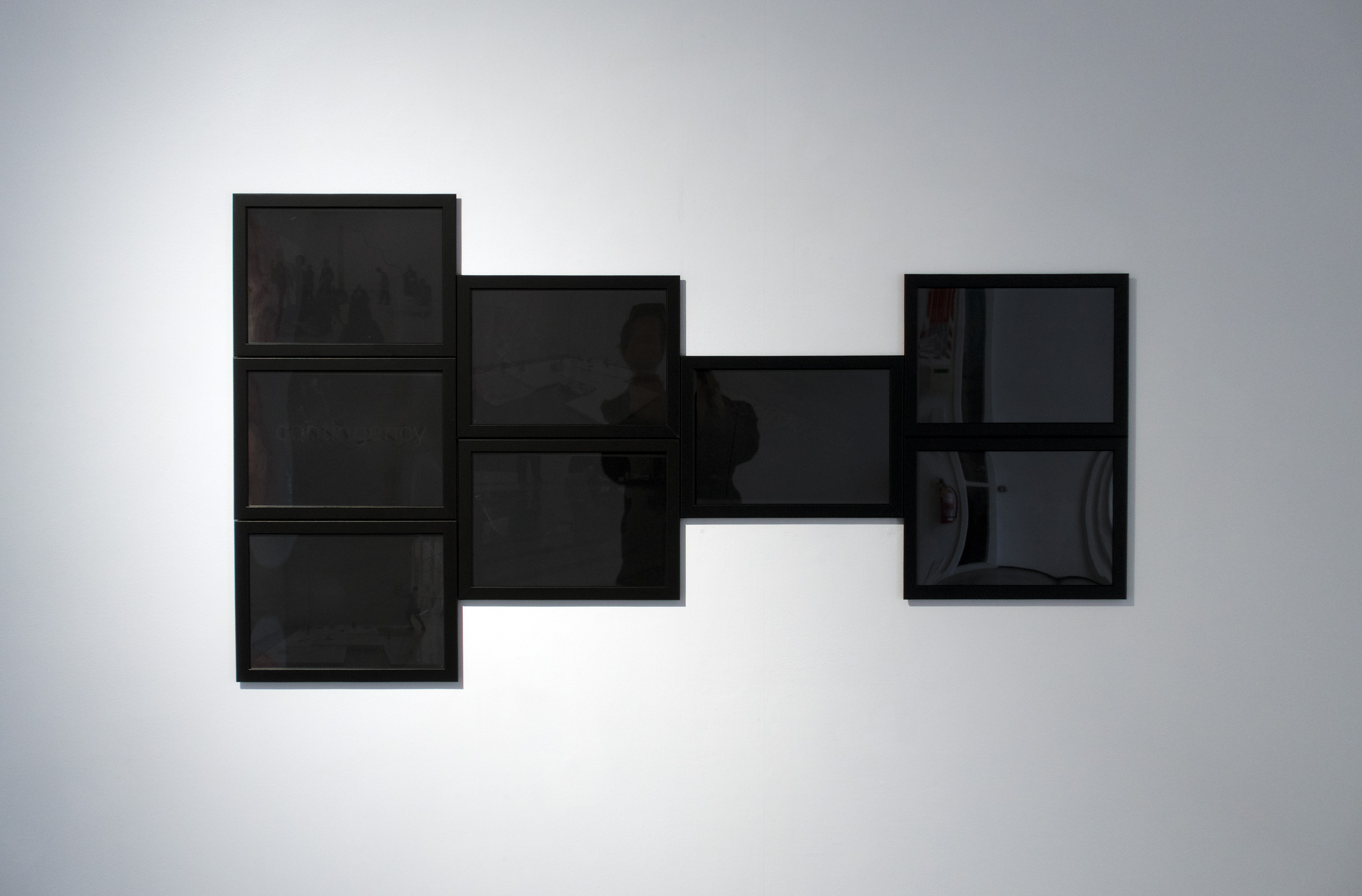 Jesse Hogan, Propositions / Situations, 2020 Inkjet on Black Craft - Composition #1. B/W photographs, typed sheets, floor maps 8 framed, total 7050 x 1538 mm