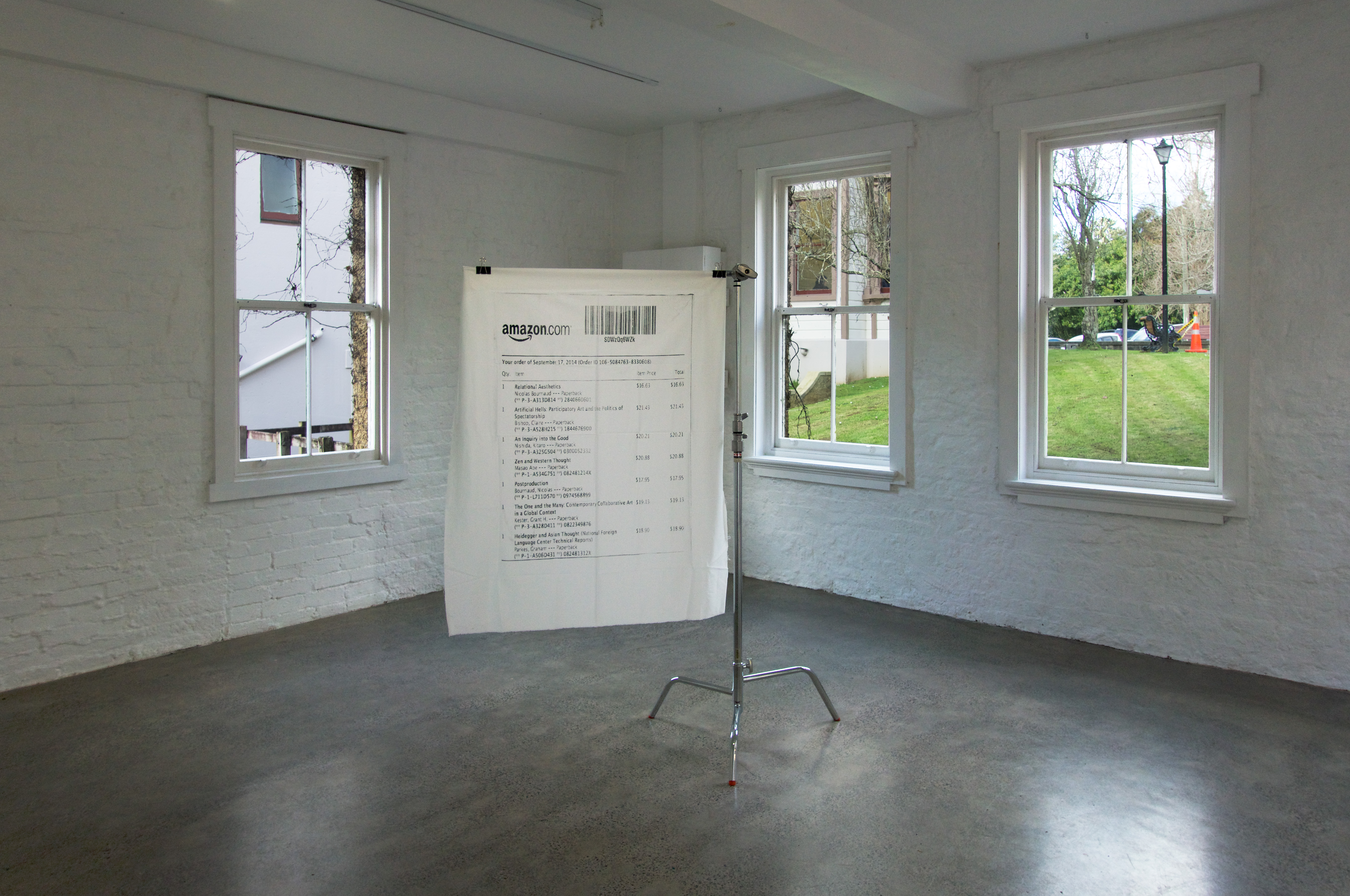 Jesse Hogan, Enlarged Receipt (amazon), 2016 (Research Book Orders [Internet as Art Market] Silkscreen on cotton, steel C-Stand with extension boom, edition of 3, 870 x 1260 mm