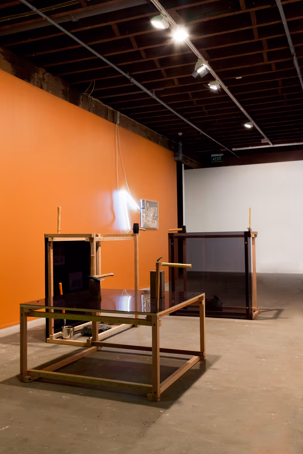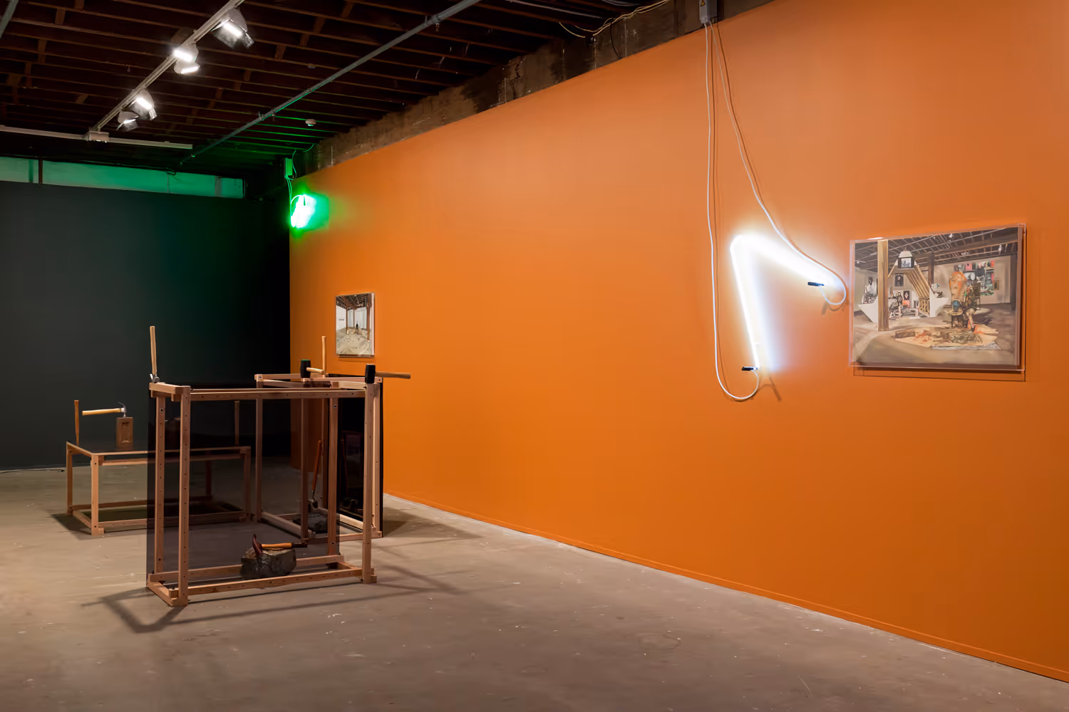 Within the structure a variety of tools and materials from the studio are arranged to give the presence of a constructive process taking place. Castings in silicon and plaster, small constructions, documents, task lists, and tools occupy the installation, which represents a temporary studio and research space. One side of the structures are cladded with reflective Black Perspex panels that will face the wall presenting a collection of paintings and neons. The structure's size totals: 2.4m in length, 2.4m in height and 1.2m in width.